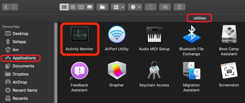 Vai su Applicazioni sul tuo Mac per accedere al monitor attività. Il passaggio successivo consiste nel confermare che tutte le attività in background e le attività connesse all'applicazione siano state terminate. Naviga verso il Applicazioni cartella e scegli il file Utilità cartella per eseguire questa operazione. Quindi, scegli Activity Monitor.
