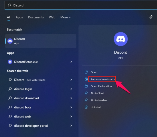 - Individua l'icona di Discord e fai clic con il pulsante destro del mouse su di essa. Scegli il pulsante “Esegui come amministratore”.