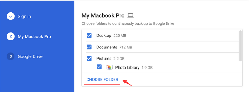 Ora, il primo elemento che vedrai a sinistra è il tuo computer. Dopo averlo selezionato, puoi scegliere quali cartelle e file e eseguire il backup e anche sincronizzare con Google Drive sul disco del computer Mac.