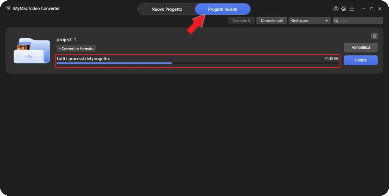 Quando si inizia a convertire i video o gli audio, tutti i video o gli audio convertiti saranno visualizzati nell'interfaccia "Progetti recenti". Quando il processo di conversione è finito, è possibile ordinarli. È anche possibile trovare i file che si desidera attraverso la barra di ricerca. Poi basta premere il pulsante Apri la cartella per vedere i file convertiti.