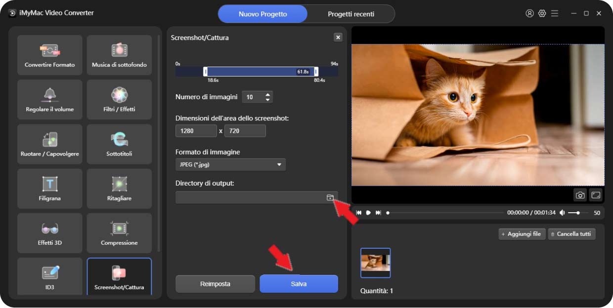 Puoi scegliere quale clip (come da 2.0s a 7.0s) che vuoi gli screenshot, poi riempi un numero che indica quanti screenshot vuoi nel Numero di Immagini. Poi personalizza le dimensioni dell'area dello screenshot, il formato dell'immagine e la directory di output e premi Salva.
